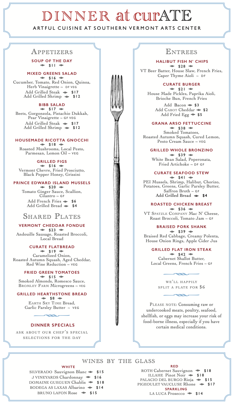 curATE comes to SVAC in partnership with Church Street Hospitality*, known for their acclaimed establishments, Barrows House Inn & Restaurant, The Dorset Inn and Dorset Bakery.