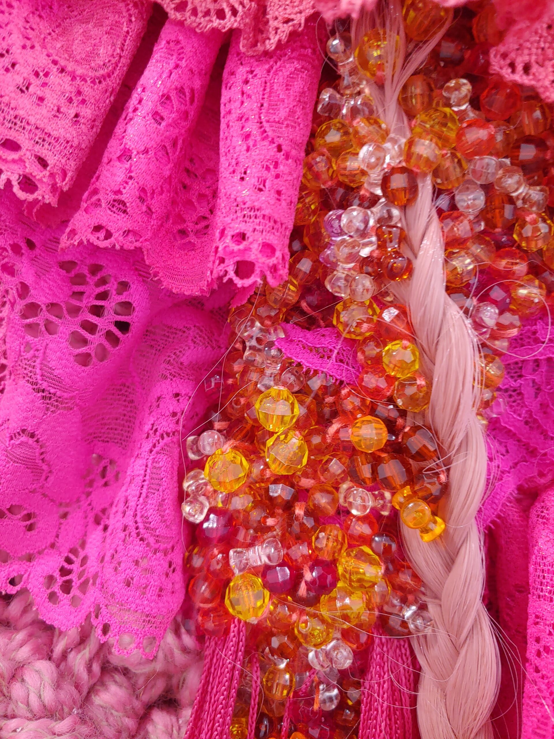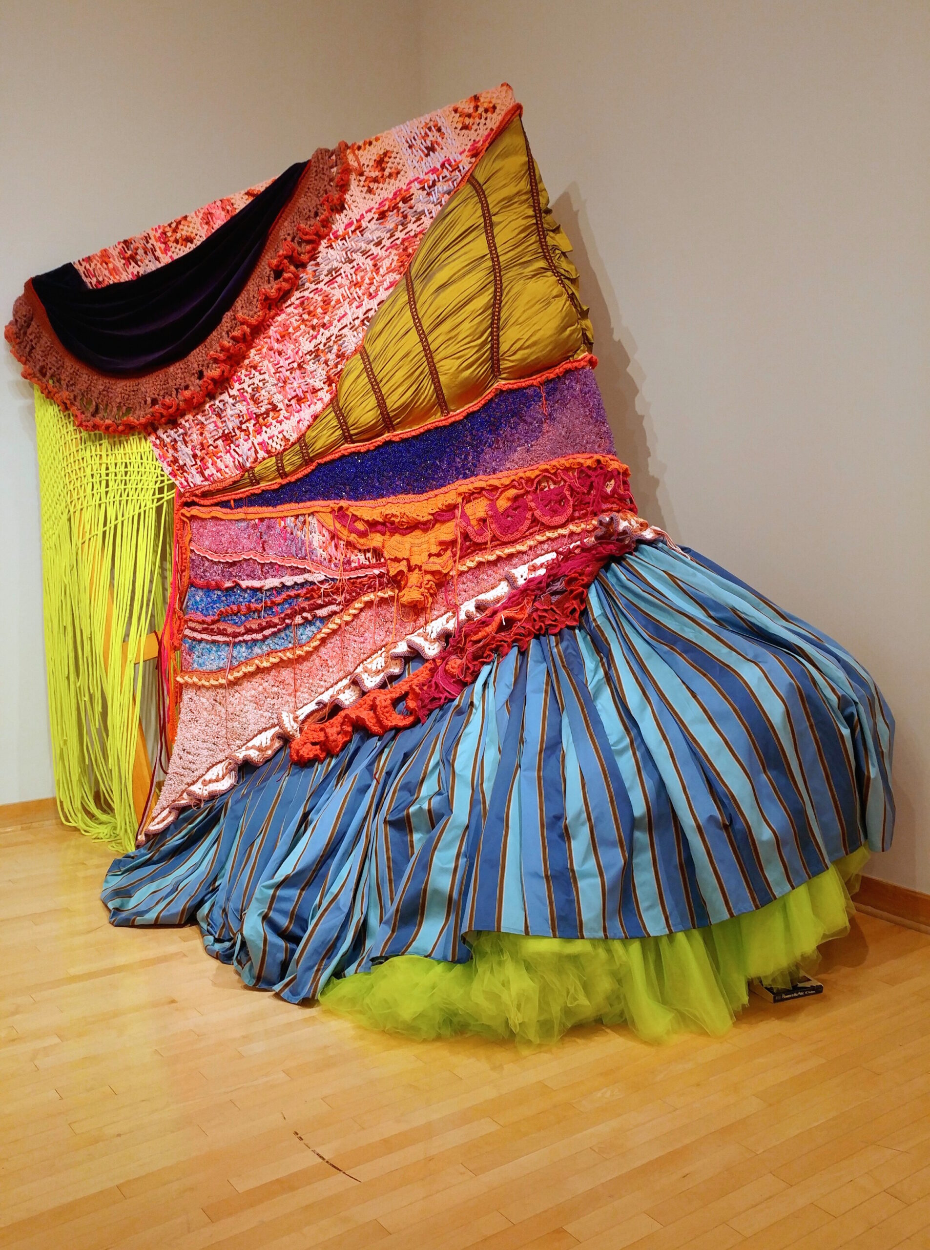 Sam Fields is a multimedia artist who creates intricate, layered sculptures. In her work, crocheted ruffle upon ruffle, beads, sequins, lace, and embroidery elevate what has been traditionally considered low brow in western society.