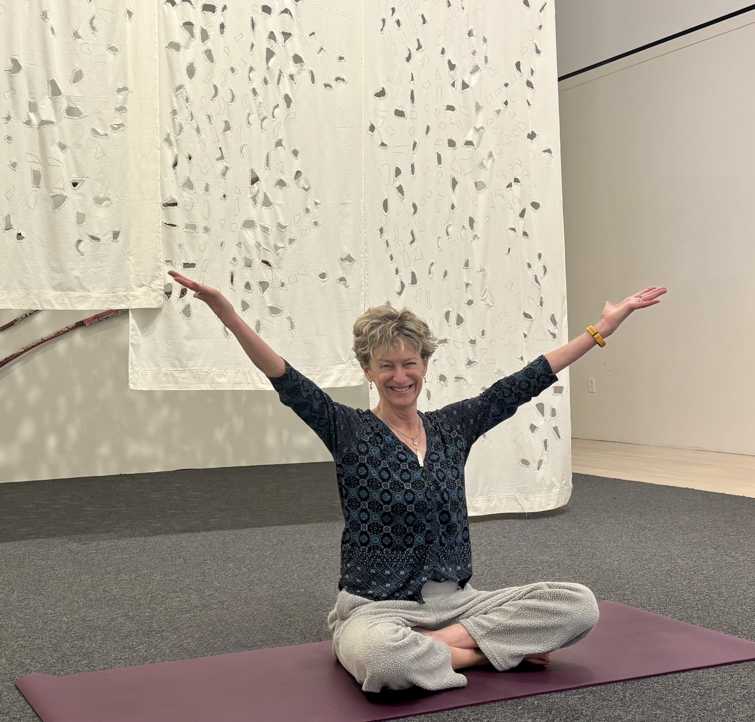 Yoga is in the galleries or the Louise Arkell Pavilion’s glassed-in studio, with floor-to-ceiling windows on three sides, when the weather is chilly or wet. When it’s outdoor yoga weather, we move to the lawn south of Arkell. Wherever we are, we move in ways that promote balance, flexibility and strength–and quiet down our chattering minds.
